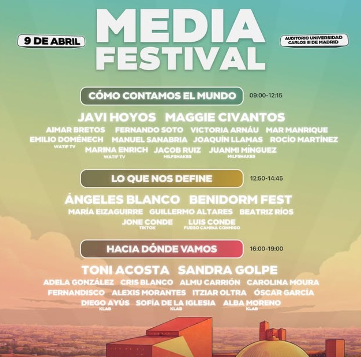 La Universidad Carlos III de Madrid acogió una nueva edición del Media Festival el pasado jueves 9 de abril. El evento, nacido de la idea de unos pocos estudiantes hace años, ha logrado convertirse en un espacio de referencia para analizar el presente y el futuro de la comunicación. Su técnica es realizar charlas, debates y ponencias en las que invitan a los alumnos interesados (además de contar con la entrada abierta a cualquier tipo de público) para comentar y aprender juntos sobre las herramientas de la información y el objetivo de comunicar, teniendo de referencia a los mejores profesionales del sector, pasando por periodistas y directores de cine hasta influencers o creadores de contenido.